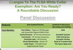 We are pleased to offer the recordings of the discussion featuring several of our panelists below. There are two recordings – Part 1 features the FLSA Overtime Rule Update with Tom Bright and Part 2 features Tom Bright, Julie Godshall Brown and Leslie Hayes.